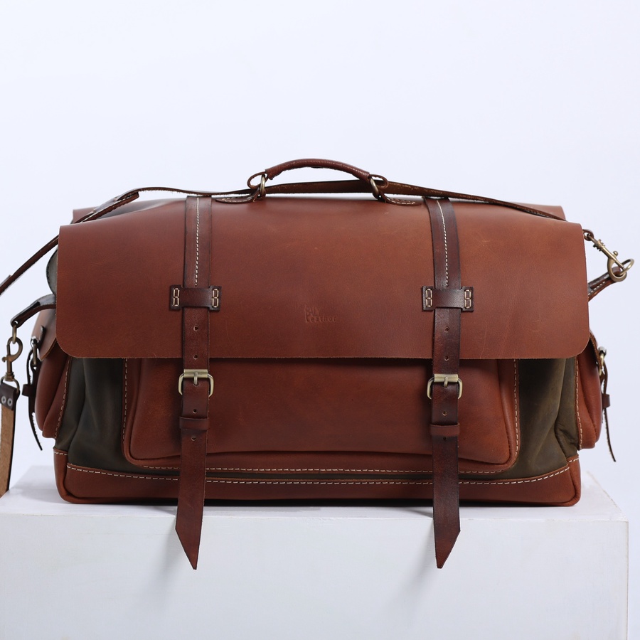 Leather Weekender is a spacious and stylish travel bag designed for short trips. Crafted from quality leather, it offers a sophisticated yet durable option for your travel needs. With a roomy interior, it accommodates clothing and essentials for a weekend getaway. The leather material not only adds a touch of luxury but also ensures longevity. The Weekender typically features sturdy handles and a detachable, adjustable shoulder strap for convenient carrying options, making it a versatile and fashionable travel companion.
